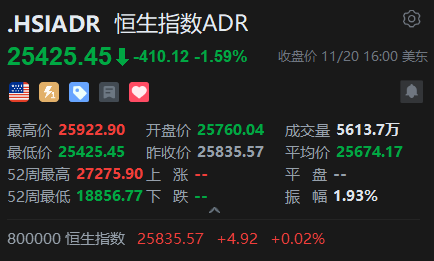 智通财经APP获悉,周四,美股三大指数集体下跌。恒生指数ADR下跌,按比例计算,收报25425.45点,较香港收市跌410.12或1.59%。 | .HSIADR 恒生指数ADR | | --- | | 25425.45 ↓ -410.12 -1.59% - 收盘价 11/20 16:00 美东 | | 三月日日 中 | | 最高价 25922.90 开盘价 25760.04 成交量 5613.7万 | | 最低价 25425.45 昨收价 25835.57 平均价 25674.17 | | 52周最高 27275.90上 涨 -- 本 智能 | | 52周最低 18856.77 下 跌 -- 振 幅 1.93% | | A | | 800000 恒生指数 25835.57 +4.92 +0.02% | 大型蓝筹股集体下跌,汇丰控股收报105.18港元,较香港收市跌2.25%;腾讯控股收报605.843港元,较香港收市跌2.44%。 | 序号 | 名称 | 港股代码 | 最新价 | 涨跌额 | 涨跌幅 | ADR代码 | ADR换算价(HKD) | 较 较港股升跌 | | --- | --- | --- | ...