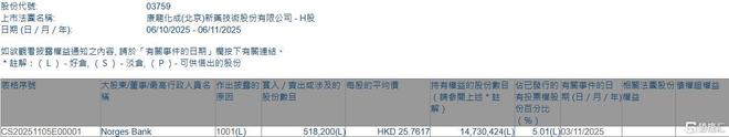 Group 1 - Norges Bank increased its stake in 康龙化成 (03759.HK) by purchasing 518,200 shares at an average price of HKD 25.7617 per share, amounting to approximately HKD 13.35 million [1] - Following the acquisition, Norges Bank's total shareholding rose to 14,730,424 shares, increasing its ownership percentage from 4.83% to 5.01% [1]