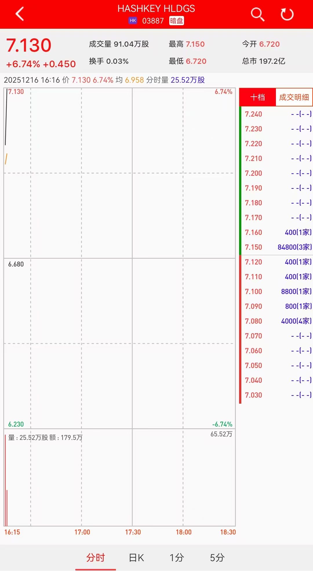 : NB XDL 776 17:00 17:30 18:00 18:30 16:15 分时 1分 5分 日K • 行情来源: 利弗莫尔证券 • | ( | HASHKEY HLDGS | | ರ ೧ | | | --- | --- | --- | --- | --- | | HK 03887 暗盘 | | | | | | 7.130 | 成交量 91.04万股 最高 7.150 | | 今开 6.720 | | | +6 74% +0 450 - 供于 0.03% | 最低 6.720 | | 总市 197.2亿 | | | 20251216 16:16 价 7.130 6.74% 均 6.958 分时量 25.52万股 | | | | | | 7.130 | | 6.74% | | | | | | | 十档 | 成交明细 | | | | | 7.240 | - -(- -) | | | | | 7.230 | - - (- -) | | | | | 7.220 | - -(- -) | | | | | 7.210 | - -(- -) | | | | | 7.200 | - -(- -) | | | | | ...