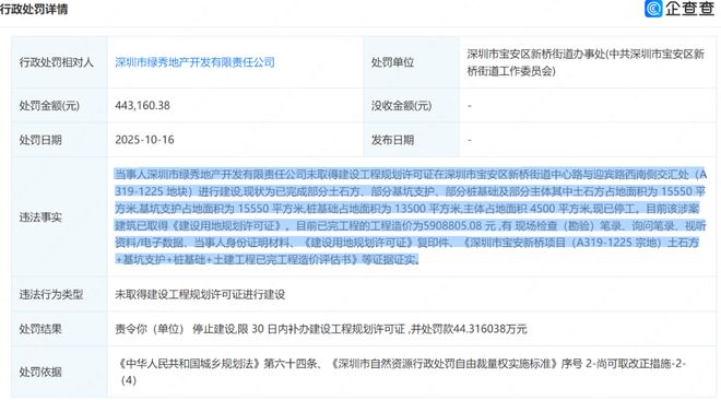 奥一新闻注意到,近期,由绿城与越秀地产联合开发的深圳新盘"锦和玉鸣",因在未取得建设工程规划 许可证的情况下进行建设,被主管部门行政处罚。 | 行政处罚相对人 | 深圳市绿秀地产开发有限责任公司 桥街道工作委员会) | 处罚单位 | 深圳市宝安区新桥街道办事处(中共深圳市宝安区新 | | --- | --- | --- | --- | | 处罚金额(元) | 443,160.38 | 没收金额(元) | | | 处罚日期 | 2025-10-16 | 发布日期 | | | 违法事实 | 当粤人深圳市绿秀地产开发有限责任公司未取得放设工程规划许可证在深圳市宝安区新桥街道中心路与迎宾路西南侧交汇处(A 319-1225 地块)进行建设,现状为已完成部分土石方、部分暴坑支护、部分妹林甜及部分主体具中土石方占地面积为 15550 平 | | | | | 方米,都坑支护占地面积为 15550平方米,在基础占地面积为 13500平方米,在体占地面积 4500平方米,现已停工,目前滚涉案 建筑已取得《建设用地规划许可证》,目前已完工程的工程造价为5908805.08 元,有 现场检查(船舶)笔录,询问笔录,视听 | | | ...