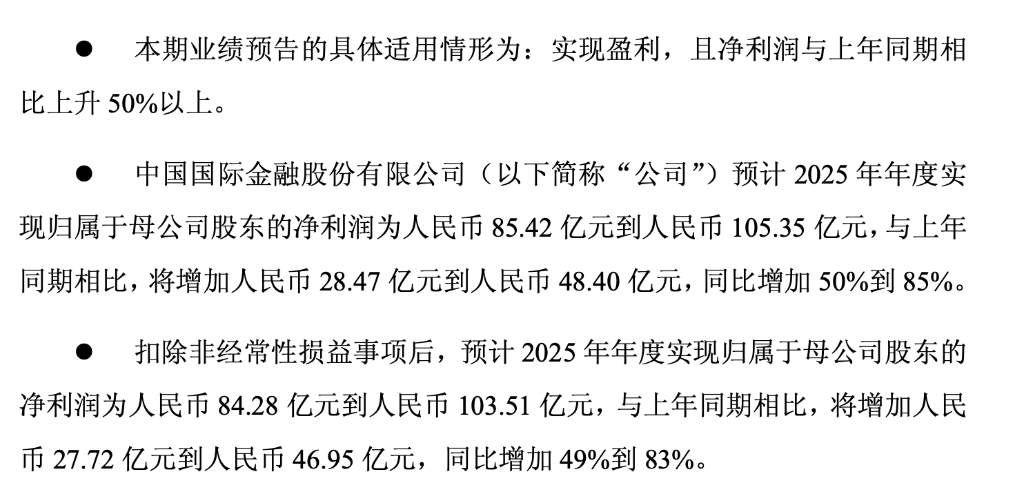 中金公司:预计2025年年度净利润为85.42亿元到105.35亿元,同比增加50%~85%