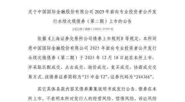 12月17日,上交所发布关于中国国际金融股份有限公司2025年面向专业投资者公开发行永续次级债券 (第二期)上市的公告。 依据《上海证券交易所公司债券上市规则》等规定,上交所同意中国国际金融股份有限公司2025年面向 专业投资者公开发行永续次级债券(第二期)于2025年12月18日起在上交所上市,并采取匹配成交、点 击成交、询价成交、竞买成交、协商成交交易方式。该债券证券简称为"25中金Y2",证券代码 为"244366"。 来源:市场资讯 ...