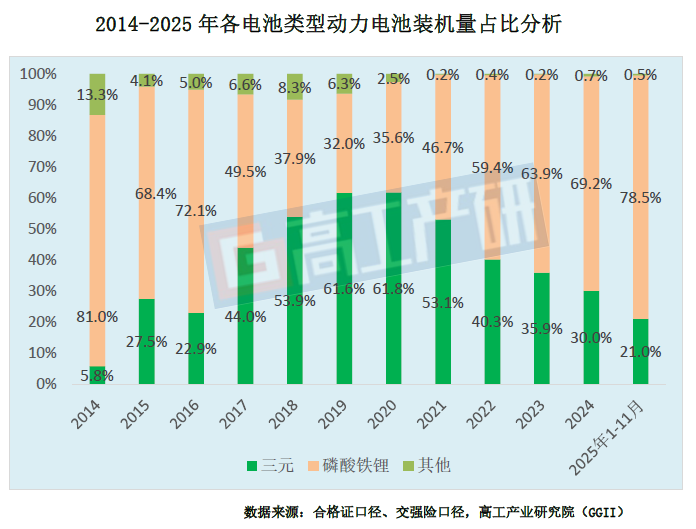 GGII:2025年1-11月国内磷酸铁锂动力电池装机份额高达78.5% 后市有望突破历史峰值
