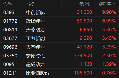 港股异动丨锂电池股拉升,业绩扭亏为盈赣锋锂业涨超7%,天齐锂业涨超3%