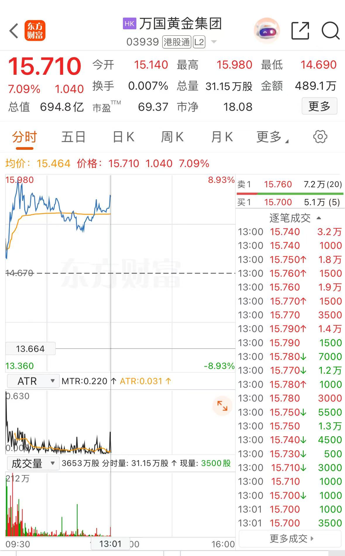 消息面上,2月4日早间,国际金价重回5000美元/盎司关口。此前,万国黄金集团发布正面盈利预告,预期2025年归母净利润约14亿元至15亿元人民币,同 比增长约143%至161%。万国黄金集团公告称,预期归母净利润增加主要是由于黄金产品销售量及价格上升所致。 来源:上海证券报·中国证券网 上证报中国证券网讯(林铭溱 记者 刘逸鹏)2月4日,万国黄金集团高开后震荡上行,盘中一度涨近9%。截至13时01分,万国黄金集团涨7.09%,报15.71港 元/股。 ...