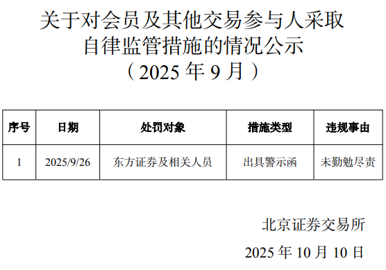 中国经济网北京10月14日讯 北交所网站近日披露的关于对会员及其他交易参与人采取自律监管措 施的情况公示(2025年9月)显示,北交所对东方证券(600958.SH,03958.HK)及相关人员出具警示 函,违规事由为未勤勉尽责。 (责任编辑:蔡情) | 民营 | 日期 | 处罚对象 | 措施类型 | 违规事由 | | --- | --- | --- | --- | --- | | | 2025/9/26 | 东方证券及相关人员 | 出具警示函 | 未勤勉尽责 | ...