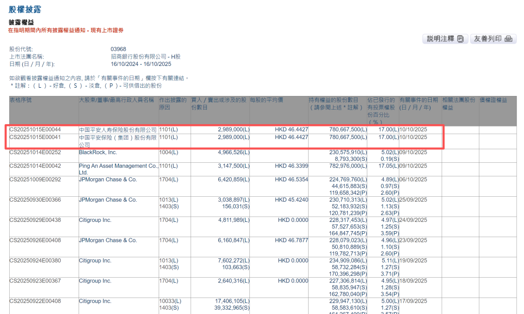 在银行股回调过后,险资继续开启买买买模式。 上海证券报记者近日统计发现,10月以来,中国平安及旗下子公司平安人寿买入招商银行H股、邮储银行H股,合计斥资约1.73亿港元。 | 股份代號: | 03968 | | --- | --- | | 上市法團名稱: | 招商銀行股份有限公司 | | 日期 (日 / 月 / 年): | 16/10/2024 - 16/10/202 | | FREE FROM | | 人胶果/直學/鼓尚们以人展名体 作曲拔路的 貝入 / 翼山或涉及的版 母板的半号情 | | | 行有健益的 反力製目 | | 伯巴致行的 自勝争计的口册 伯闘法國版仍 民健品健益 | | --- | --- | --- | --- | --- | --- | --- | --- | | | | 뷰즈 份數目 | | | (請參閱上述*註解) | 有投票權股 (日 / 月 / 年) | 權益 | | | | | | | | 份百分比 | | | | | | | | | (%) | | | CS20251015E00044 | 中国平安人寿保险股份有限公司 1101(L) | | 2,989,000(L) | H ...
