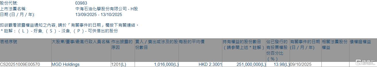 MGD Holdings减持中海石油化学(03983)101.6万股 每股作价约2.3港元