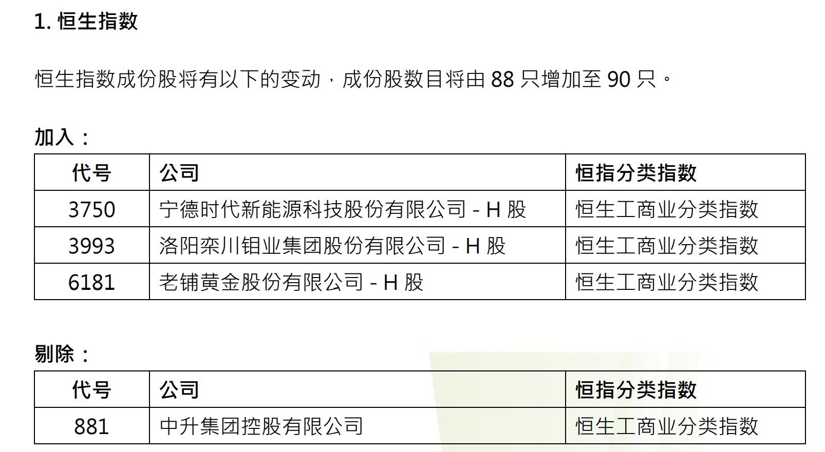 每经编辑|段炼 2月13日,恒生指数公司宣布截至2025年12月31日的恒生指数系列季度检讨结果。上述所有变动将于 2026年3月6日(星期五)收市后实施,并于2026年3月9日(星期一)起生效。 作为港股市场的核心指数,恒生指数成分股调整备受市场关注。 根据相关检讨结果,恒生指数成份股将加入宁德时代(03750)、洛阳钼业(03993)、老铺黄金 (06181)等3只股票,同时将剔除中升控股(00881)1只股票,经调整后,恒生指数成份股数目将由88 只增加至90只。值得注意的是,这里面老铺黄金近期涨势凌厉,2026年以来股价累计涨幅接近两成。 | 代号 | 公司 | 恒指分类指数 | | --- | --- | --- | | 3750 | 宁德时代新能源科技股份有限公司 - H 股 | 恒生工商业分类指数 | | 3993 | 洛阳栾川铝业集团股份有限公司 - H 股 | 恒生工商业分类指数 | | 6181 | 老铺黄金股份有限公司 - H 股 | 恒生工商业分类指数 | | 代号 | 公司 | 恒指分类指数 | | --- | --- | --- | | 881 | 中升集团控股有限公司 | 恒生工 ...