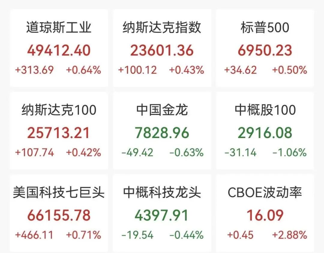 周一美国三大股指集体收涨,道指涨0.64%报49412.4点,标普500指数涨0.5%报6950.23点,纳指涨0.43%报23601.36点。 CREDOTECHNOLOGY跌逾3%,ASTERALABS跌逾3%,超威半导体跌逾3%,美光科技跌逾2%。 中概股方面,纳斯达克中国金龙指数跌0.63%,热门中概股多数走低,禾赛跌10.06%,小马智行跌5.78%,再鼎医药、好未来、新东方、百度跌超3%,小 鹏汽车跌2.39%,阿里巴巴跌1.07%。理想汽车涨1.38%,腾讯音乐涨0.71%,拼多多涨0.45%。 商品方面,周二开盘现货黄金小幅上涨,现货白银拉升超2%。 | 道琼斯工业 | 纳斯达克指数 | 标普500 | | --- | --- | --- | | 49412.40 | 23601.36 | 6950.23 | | +313.69 +0.64% +100.12 +0.43% +34.62 +0.50% | | | | 纳斯达克100 | 中国金龙 | 中概股100 | | 25713.21 | 7828.96 | 2916.08 | | +107.74 +0.42% -49.42 -0.63% ...