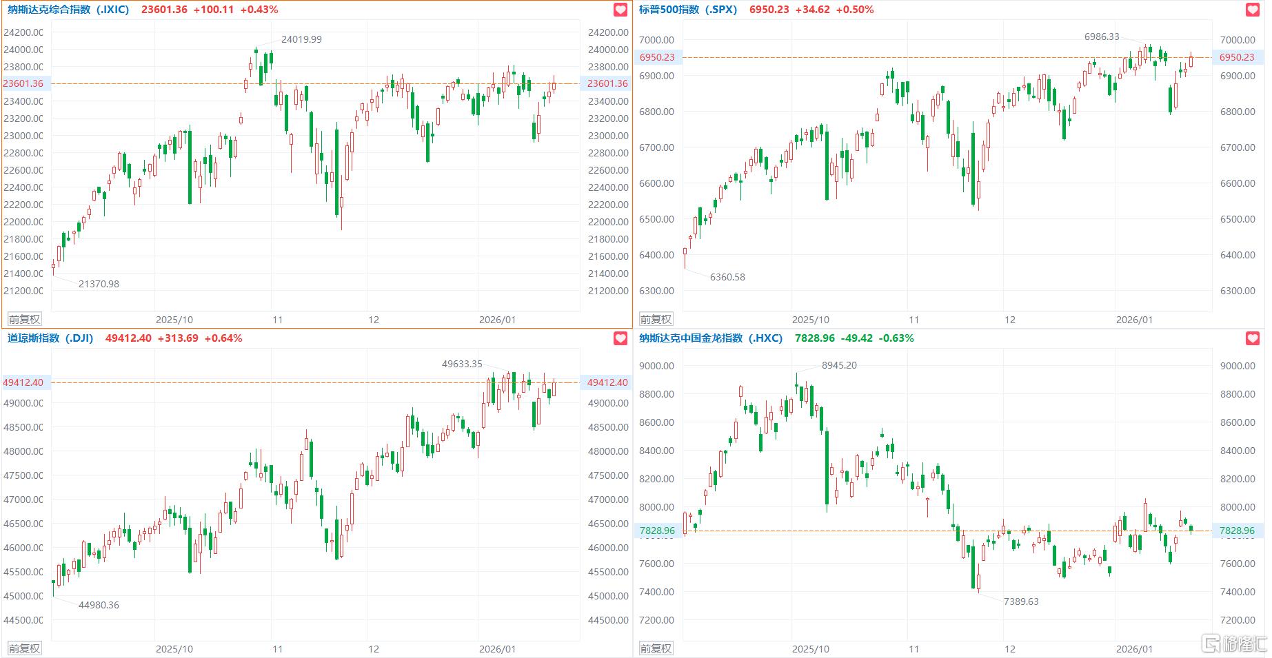 当地时间1月26日,美股三大指数同步收涨,道琼斯指数上涨0.64%,标普500指数上涨0.5%,纳斯达克 综合指数上涨0.43%。 市场有风险,投资需谨慎。本文基于第三方数据整理,仅供参考,不构成任何投资建议。 本文源自:市场资讯 作者:观察君 英特尔当日跌超5%,该公司此前披露今年第一季度营收预期在117亿至127亿美元之间,低于分析师预 期的中值,叠加前期估值透支及市场对其先进制程落地进度的担忧,引发部分投资者获利了结。 中概股整体小幅走弱,纳斯达克中国金龙指数收跌0.63%,热门中概股多数下跌,百度、名创优品跌超 3%,小鹏汽车跌超2%,阿里巴巴跌超1%;理想汽车、微博涨超1%。 市场当前同时关注多重事件进展:美联储将于本周公布今年首次政策决议,市场普遍预期维持隔夜利率 不变,但押注年内可能降息两次;美国政府停摆风险仍在持续,多名民主党参议员表示将投票反对包含 国土安全部拨款的政府拨款法案,联邦政府在1月底因资金耗尽部分停摆的可能性上升。 科技股板块呈现分化走势,苹果股价上涨近3%,单日市值增加超1000亿美元。本周超90家标普500成分 公司将发布季度财报,苹果、微软、Meta等科技巨头扎堆披露,当前 ...