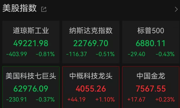 每经记者|杜宇 每经编辑|何小桃 宋思艰 记者|杜宇 编辑|何小桃 宋思艰 校对|魏文艺 2月23日晚,美股三大指数集体低开低走。截至发稿,标普500指数跌0.43%,道指跌0.81%,纳指跌0.51%。 | < W | 纳斯达克中国金龙指数(HXC) | | | | --- | --- | --- | --- | | | 7561.91 12.03 +0.16% | | | | 京来 | 成分 资讯 相关基金 | | 月度收益 | | 蔚来 | | 5.262 | 3.78% | | NIO.N | | | | | 禾赛科技 | | 28.745 | 3.55% | | HSAI.O | | | | | 水滴公司 WDH.N | | 1.905 | 3.53% | | 亚朵 | | 40.190 | 3.16% | | ATAT.O | | | | | 正业生物 | | 0.900 | 2.27% | | ZYBT.O | | | | | 雾芯科技 | | 2.420 | 2.11% | | RLX.N | | | | | 微博 | | 10.400 | 2.06% | | WB.O | | | | | 百 ...