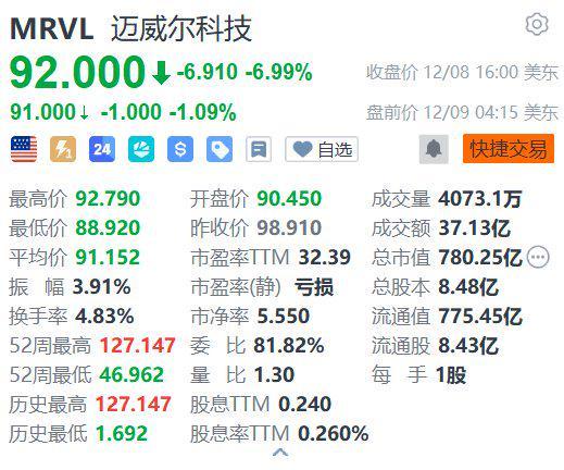 | MRVL 迈威尔科技 | | | --- | --- | | 92.000 t -e a 10 -e 900 TE | 收盘价 12/08 16:00 美东 | | 91.000 -1.000 -1.09% | 盘前价 12/09 04:15 美东 | | 一 7 24 4 5 8 9 间 0 0选 | ● 快捷交易 | | 最高价 92.790 | 成交量 4073.1万 开盘价 90.450 | | 最低价 88.920 | 昨收价 98.910 成交额 37.13亿 | | 平均价 91.152 | 市盈率TTM 32.39 总市值 780.25亿 (-- | | 振 幅 3.91% | 市盈率(静) 亏损 总股本 8.48亿 | | 换手率 4.83% | 市净率 5.550 流通值 775.45亿 | | 52周最高 127.147 委 比 81.82% | 流通股 8.43亿 | | 52周最低 46.962 量 比 1.30 | 每 手 1股 | | 历史最高 127.147 股息TTM 0.240 | | | 历史最低 1.692 | 股息率ITM 0.260% | 昨日收跌6.99%的迈 ...