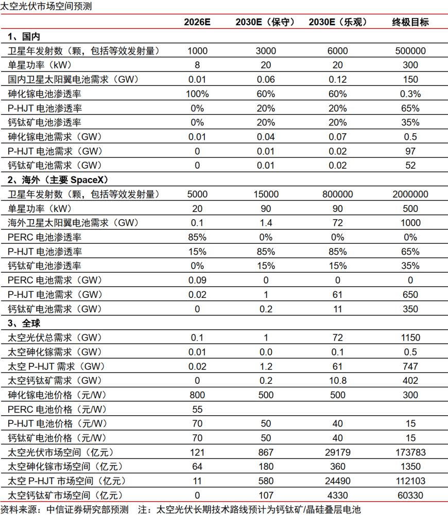 Core Insights - The demand for space photovoltaics is expected to experience exponential growth, driven by investments from companies like Tesla and SpaceX in photovoltaic manufacturing to support orbital computing and AI [1] - Leading Chinese photovoltaic equipment manufacturers are well-positioned to enter the supply chains of major players like Tesla and SpaceX, potentially securing substantial orders and opening new growth opportunities [1] - Space photovoltaic equipment may exhibit significant inflationary effects, leading to a substantial increase in value [1] Domestic Market Projections - By 2026, the annual satellite launch count in China is projected to reach 1,000, increasing to 3,000 by 2030 under conservative estimates and potentially 6,000 under optimistic scenarios, with a long-term goal of 500,000 [2] - The demand for satellite solar wing batteries in China is expected to grow from 0.01 GW in 2026 to 0.12 GW by 2030 under optimistic conditions, with a long-term target of 150 GW [2] - The penetration rates for P-HJT and perovskite batteries are anticipated to reach 20% by 2030, with long-term goals of 65% and 35% respectively [2] Overseas Market Projections - The annual satellite launch count overseas, primarily driven by SpaceX, is expected to rise from 5,000 in 2026 to 15,000 by 2030, with an ultimate target of 20 million [2] - The demand for overseas satellite solar wing batteries is projected to increase from 0.1 GW in 2026 to 72 GW by 2030 under optimistic estimates, with a long-term goal of 1,000 GW [2] - The penetration rate for P-HJT batteries is expected to reach 85% by 2030, with a long-term target of 65% [2] Global Market Projections - The total demand for space photovoltaics globally is projected to grow from 0.1 GW in 2026 to 72 GW by 2030 under optimistic conditions, with a long-term target of 1,150 GW [2] - The market space for space photovoltaics is expected to expand significantly, from 121 billion yuan in 2026 to 29,179 billion yuan by 2030 under optimistic estimates, with a long-term goal of 173,783 billion yuan [2] - The price of P-HJT batteries is expected to decrease from 70 yuan/W in 2026 to 15 yuan/W in the long term, indicating a trend towards cost reduction in the industry [2]