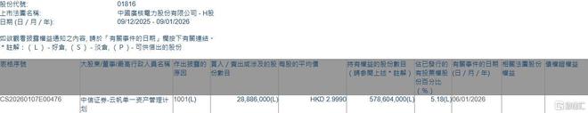 中广核电力(01816.HK)获中信证券-云帆单一资产管理计划增持2888.6万股