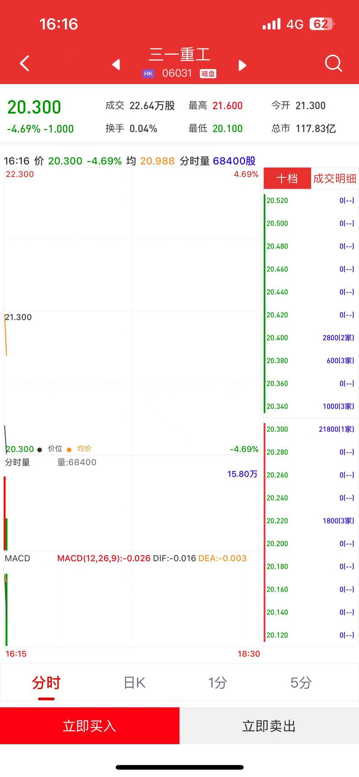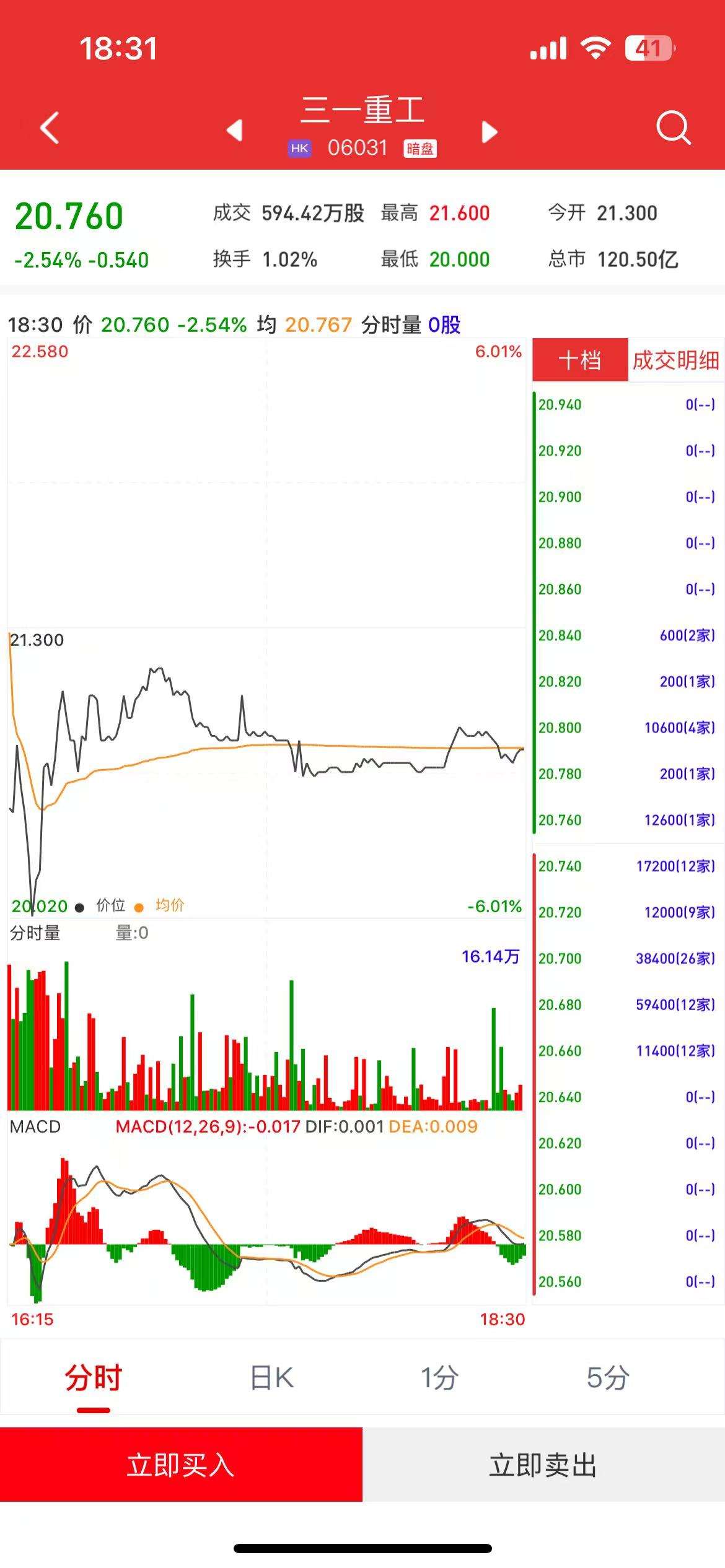 | 22.580 | 6.01% | 十档 20.940 | | | --- | --- | --- | --- | | | | 20.920 20.900 20.880 | | | | | 20.860 | | | 21.300 | | 20.840 | 600 | | | | 20.820 | 20( | | | | 20.800 | 10600 | | | | 20.780 | 20( | | | | 20.760 | 1260( | | | | 20.740 | 17200( | | 20 020 · 价位 · 均价 | -6.01% | 20.720 | 1200( | | 分时量 量:0 | | | | 16.14万 20.700 38400( 20.680 59400( 11400( 20.660 20.640 MACD MACD(12,26,9):-0.017 DIF:0.001 DEA:0.009 20.620 20.600 20.580 20.560 16:15 18:30 分时 1分 5分 日K 立即买入 立即卖出 · 行情来源: 利弗莫尔证券 · 智通财经APP获悉,三一重工(0603 ...