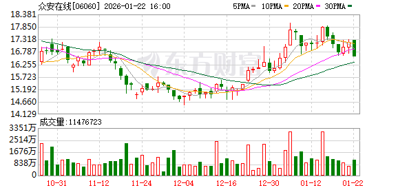 众安在线 分时图 日K线 周K线 月K线 17.10 -0.34 -1.95% 2.98% 2.01% 0.97% 0.00% 0.97% 2.01% 2.98% 16.92 17.09 17.27 17.44 17.61 17.79 17.96 09:30 10:30 12:00/13:00 14:00 16:10 0 16万 32万 48万 众安在线(06060)发布公告,于2025年1月1日至2025年12月31日所获得的原保险保费收入总额约为人民 币356.43亿元,同比增加6.66%。 ...