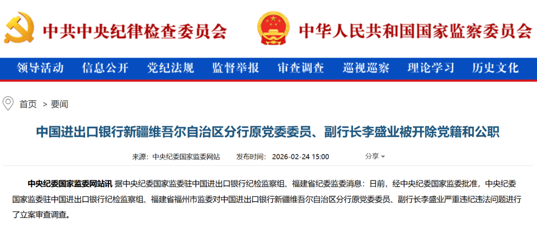 【导读】中国进出口银行新疆维吾尔自治区分行原党委委员、副行长李盛业被开除党籍和公职 经查,李盛业存在下列问题: 金融反腐最新通报来了! ●丧失理想信念,背弃初心使命,对抗组织审查,与他人串供虚构钱款性质,在组织核查有关问题时提供虚假情况掩盖事实; 2月24日,中央纪委国家监委官网通报:中国进出口银行新疆维吾尔自治区分行原党委委员、副行长李盛业被开除党籍和公职。 据中央纪委国家监委驻中国进出口银行纪检监察组、福建省纪委监委消息:日前,经中央纪委国家监委批准,中央纪委国家监委驻中国进出口银行纪检监 察组、福建省福州市监委对中国进出口银行新疆维吾尔自治区分行原党委委员、副行长李盛业严重违纪违法问题进行了立案审查调查。 公开信息显示,李盛业在中国进出口银行工作多年。2024年4月,国家金融监督管理总局新疆监管局核准李盛业中国进出口银行新疆维吾尔自治区分行副 行长的任职资格。 2025年11月,中央纪委国家监委官网通报:中国进出口银行新疆维吾尔自治区分行党委委员、副行长李盛业涉嫌严重违纪违法,接受中央纪委国家监委驻 中国进出口银行纪检监察组纪律审查和福建省福州市监察委员会监察调查。 此前,中国进出口银行已有多名干部在2 ...