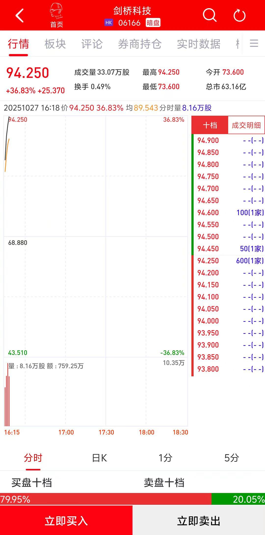 智通财经APP获悉,剑桥科技(06166)将于10月28日(周二)在香港挂牌。截至发稿,利弗莫尔证券暗盘交易显示报价94.25港元,较招股价68.88港元上涨 36.83%,每手50股,不计手续费,每手赚1268.5港元。 | 94.250 | 36.83% | | | | --- | --- | --- | --- | | | | 十档 | 成交明细 | | | | 94.900 | = =(- -) | | | | 94.850 | - -(- -) | | | | 94.800 | - -(- -) | | | | 94.750 | - -(- -) | | | | 94.700 | - -(- -) | | | | 94.650 | - -(- -) | | | | 94.600 | 100(1家) | | | | 94.550 | - -(- -) | | | | 94.500 | - -(- -) | | 68.880 | | 94.450 | 50(1家) | | | | 94.250 | 600(1家) | | | | 94.200 | - -(- -) | | | | 94.150 | - ...