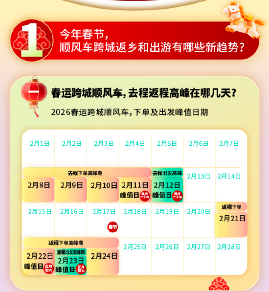 今年春节,顺风车人气提升更快城市前五,预计依次为澄迈、五指山、株洲、曲靖和玉溪。而Top 30城 市中,有7座在海南、4座在山东、福建和四川各3座。 今年春节前夕,跨城顺风车返乡热门线路前五将为深圳-东莞、深圳-广州、深圳-惠州、北京-廊坊、上 海-苏州。 责任编辑:杨赐 新浪科技讯 2月5日上午消息,嘀嗒出行近日发布《2026 嘀嗒顺风车春运出行预测》,基于嘀嗒顺风车 大数据,解读顺风车返乡及出游新趋势。 《预测》显示,今年春运期间,顺风车去程下单及出发峰值日将分别在2月11日(腊月二十四)和2月12 日(腊月二十五),同时2月8日至11日,去程下单都将持续高位;返程下单及出发峰值日将分别在2月 22日(正年初六)和2月23日(正月初七),同时,去程和返程的日下单量,在峰值日前后几天都将持 续保持高位。 今年春节期间,目的地为酒店及旅游的跨城顺风车下单,预计在大年初五至初九均将保持高位。和以目 的地为住宅的跨城顺风车下单规模相比,比例约1:2,这一定程度印证了假期出游和走亲访友的规模对 比。 今年春节前夕,跨城顺风车住宅下单中,预计将有超15%直接从单位出发,一站到家。同时,春运跨城 顺风车,用户更偏好预约 ...