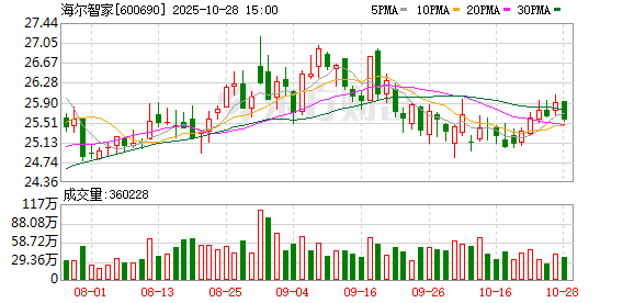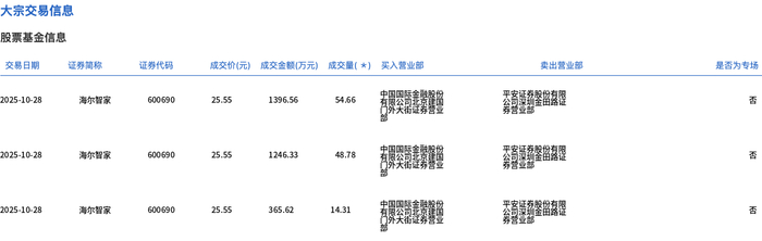 海尔智家10月28日现3笔大宗交易 总成交金额3008.51万元 溢价率为0.00%