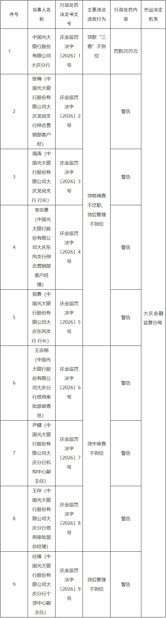 中国经济网北京2月2日讯 国家金融监督管理总局网站1月29日公布的大庆监管分局行政处罚信息公 开表(庆金监罚决字〔2026〕1、2、3、4、5、6、7、8、9号)显示,中国光大银行股份有限公司大庆 分行贷款"三查"不到位。 大庆金融监管分局对中国光大银行股份有限公司大庆分行罚款20万元;分别对张楠(中国光大银行 股份有限公司大庆龙岗支行综合营销部客户经)、周涛(中国光大银行股份有限公司大庆龙岗支行 行 长)、李宗勇(中国光大银行股份有限公司大庆东风支行综合营销部客户经理)、郑勇(中国光大银行 股份有限公司大庆东风支行 行长)、王志刚(中国光大银行股份有限公司大庆分行信用审批部审查 员)、尹健(中国光大银行股份有限公司大庆分行机构中心副主任)、王存(中国光大银行股份有限公 司大庆分行信用审批部总经理)、任锋(中国光大银行股份有限公司大庆分行个贷中心副主任)警告。 | 以下为原文: | | --- | | 序号 | 当事人名 | 行政处罚 决定书文 | 主要违法 | 行政处罚内 | 作出决定 | | --- | --- | --- | --- | --- | --- | | | 称 | ינים | 违规行为 | ...