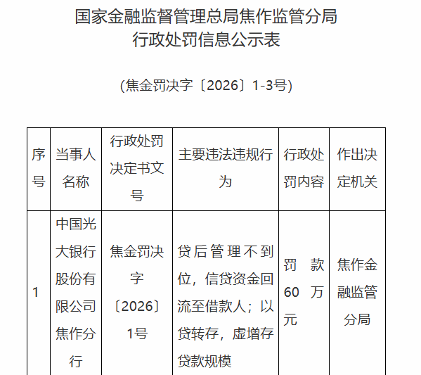 中国经济网北京1月24日讯 国家金融监督管理总局23日发布焦作监管分局行政处罚信息公示表 (焦金罚决字〔2026〕1、2、3号)。 中国光大银行股份有限公司(简称"光大银行",601818.SH)焦作分行存在以下违法违规事实:贷 后管理不到位,信贷资金回流至借款人;以贷转存,虚增存贷款规模。焦作金融监管分局决定对其处以 罚款60万元。 毋志鹏(光大银行解放路支行公司业务部原经理)存在以下违法违规事实:贷后管理不到位,信贷 资金回流至借款人。焦作金融监管分局决定对其处以警告。 任丽萍(光大银行焦作分行原副行长)存在以下违法违规事实:以贷转存,虚增存贷款规模。焦作 金融监管分局决定对其处以警告。 以下为原文: | 序 | 当事人 | 行政处罚 决定书文 | 主要违法违规行 | 行政处 | 作出决 | | --- | --- | --- | --- | --- | --- | | 름 | 名称 | 를 | 为 | 罚内容 | 定机关 | | | 中国光 大银行 | 焦金罚决 | 贷后管理不到 | | | | | 股份有 | 字 | 位,信贷资金回 | 明 款 | 焦作金 | | 1 | | | | 60 万 | 融 ...