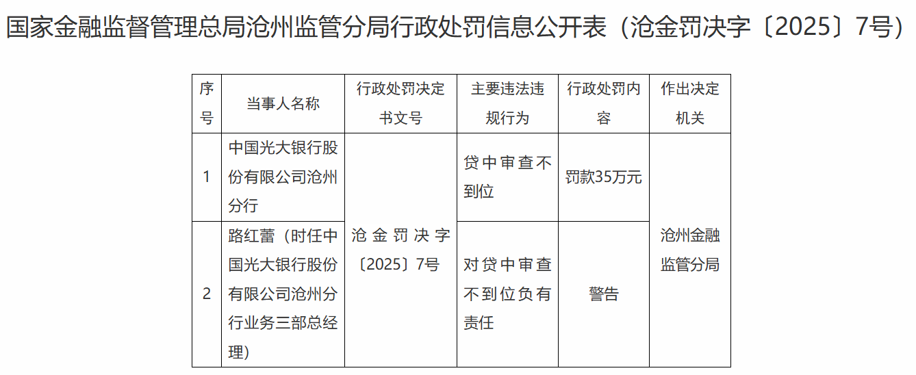 中国经济网北京1月8日讯 国家金融监督管理总局网站1月6日披露了沧州监管分局行政处罚信息公开表(沧金罚决字〔2025〕7号)。 | 序 | 当事人名称 | 行政处罚决定 | 主要违法违 | 行政处罚内 | 作出决定 | | --- | --- | --- | --- | --- | --- | | 름 | | 书文号 | 规行为 | 容 | 机关 | | 1 | 中国光大银行股 份有限公司沧州 分行 | | 贷中审查不 到位 | 罚款35万元 | | | 2 | 路红蕾(时任中 | 沧金罚决字 〔2025〕 7号 | 对贷中审查 | 整告 | 沧州金融 监管分局 | | | 国光大银行股份 | | | | | | | 有限公司沧州分 | | 不到位负有 | | | | | 行业务三部总经 | | 责任 | | | | | 彈) | | | | | 中国光大银行(601818)股份有限公司沧州分行贷中审查不到位,被处罚款35万元。时任中国光大银行股份有限公司沧州分行业务三部总经理路红蕾,对贷 中审查不到位负有责任,被处警告。 以下为原文: ...