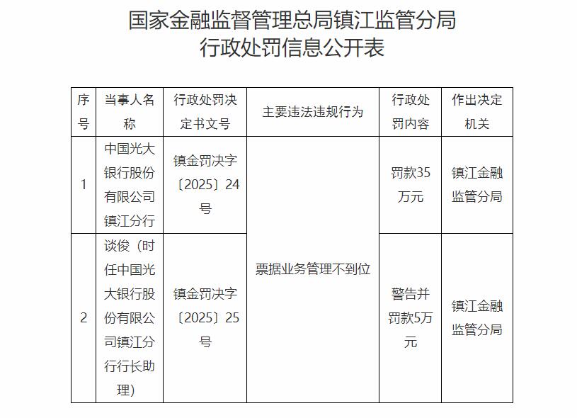 Group 1 - The administrative penalty information released by the Jiangsu Provincial Financial Supervision Administration indicates that China Everbright Bank's Zhenjiang branch was fined 350,000 yuan for inadequate management of its bill business [1][2] - Tan Jun, the assistant president of China Everbright Bank's Zhenjiang branch at the time, received a warning and was fined 50,000 yuan for the same issue [1][2]