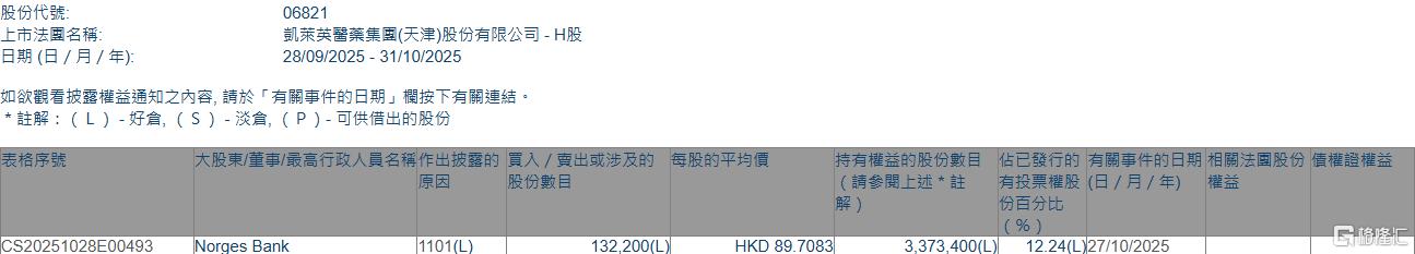 格隆汇10月31日丨根据联交所最新权益披露资料显示,2025年10月27日,凯莱英(06821.HK)获Norges Bank在场内以每股均价89.7083港元增持13.22万股,涉 资约1185.94万港元。 | 表格序號 | 大股東/董事/最高行政人員名稱作出披露的 買入 / 賣出或涉及的 每股的平均價 | | | | | 持有權益的股份數目 佔已發行的 有關事件的日期 | | | --- | --- | --- | --- | --- | --- | --- | --- | | | | | 股份數目 | | | (請參閱上述*註 | 有投票權股 (日 / 月 / 年) | | | | | | | | | 份自分玩 | | CS20251028E00493 | Norges Bank | 1101(L) | | 132,200(L | HKD 89.7083 | 3.373.400(L) | 12.24(L)27/10/2025 | | 股份代號: | | --- | | 上市法國名稱: | | 日期 (日 / 月 / 年): | 增持后,Norges Bank最新持股数目为337.34万股,持股比例由1 ...