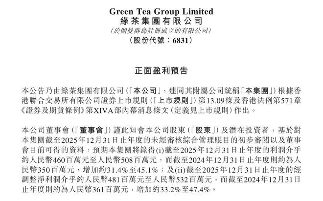 绿茶集团2025年净利预计大增31.4%至45.1%