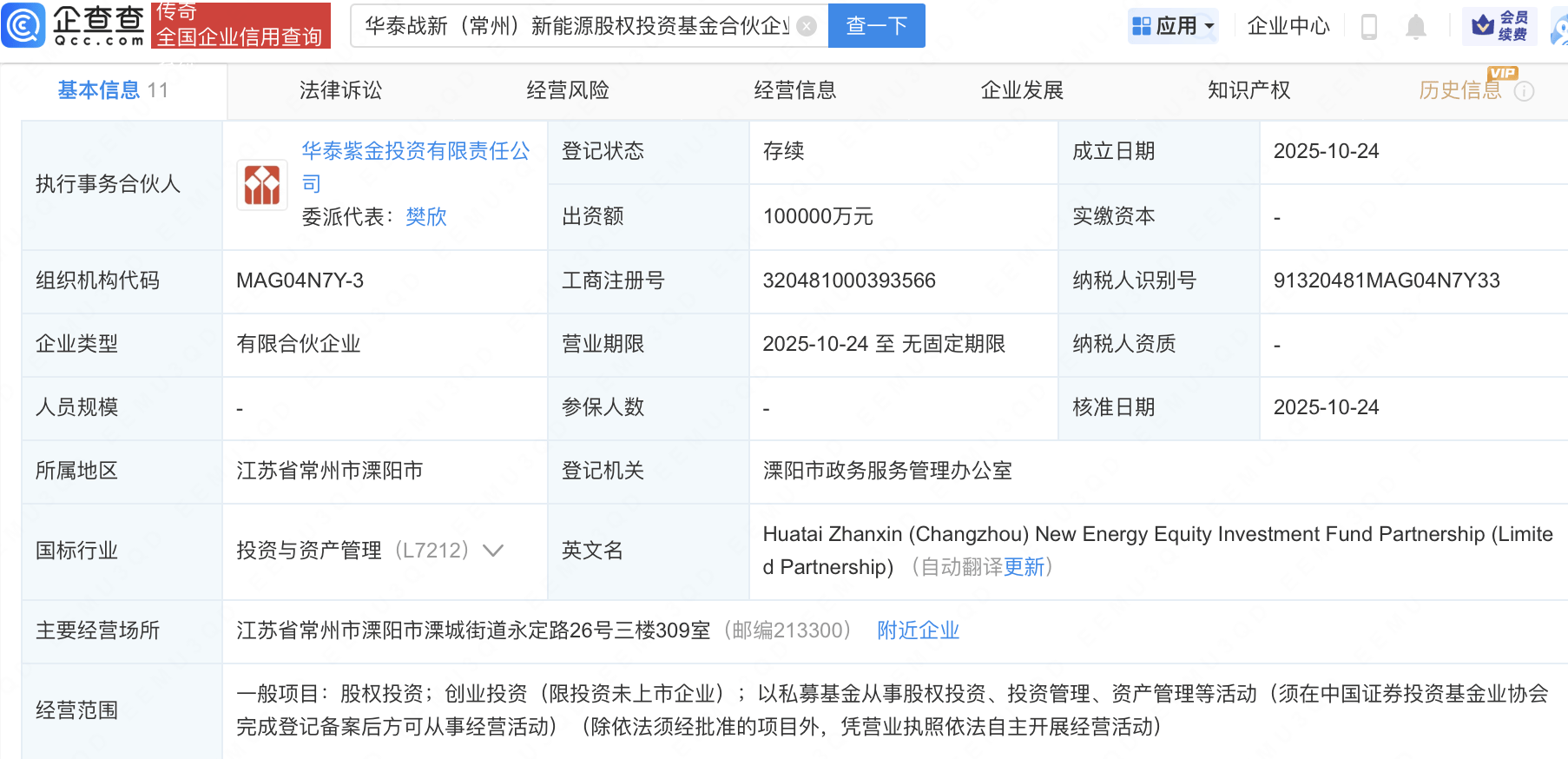 Core Insights - Huatai Zhixin (Changzhou) New Energy Equity Investment Fund Partnership (Limited Partnership) has been established with a total investment of 1 billion RMB, focusing on equity investment and venture capital activities [1] Group 1: Company Information - The executing partner of the fund is Huatai Zijin Investment Co., Ltd., a subsidiary of Huatai Securities [1] - The fund's business scope includes private equity investment, investment management, and asset management [1] Group 2: Investment Details - The fund is co-invested by Huatai Zijin Investment Co., Ltd., Hongwei Technology, and Jiangsu Changzhou New Energy Industry Special Mother Fund (Limited Partnership) [1] - The total capital contribution is 1 billion RMB, which is equivalent to 1000 million RMB [1]