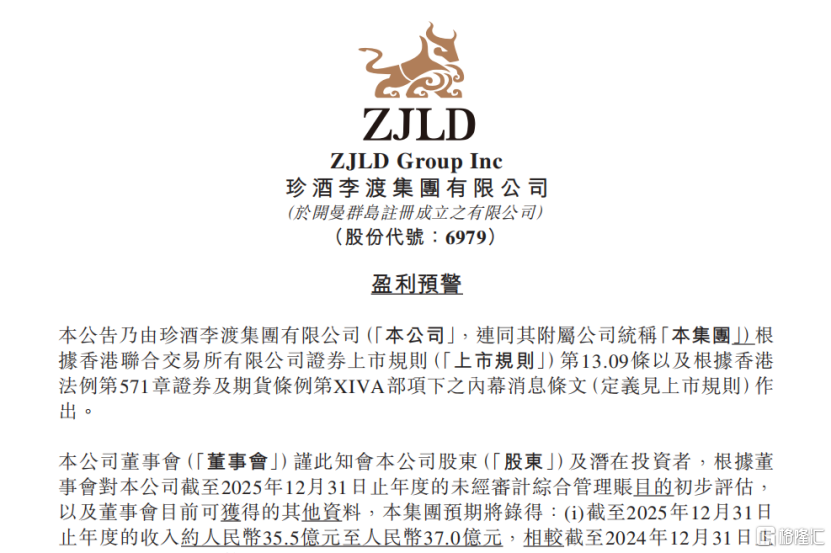 香港交易及結算所有限公司及香港聯合交易所有限公司對本公告的內容概不負責,對其準確性 或完整性亦不發表任何聲明,並明確表示,概不對因本公告全部或任何部份內容而產生或因倚 賴該等內容而引致的任何損失承擔任何責任。 ZJLD Group Inc 珍酒李渡集團有限公司 (於開曼群島註冊成立之有限公司) (股份代號:6979) 盈利預警 本公司認為,經調整淨利潤(非國際財務報告準則計量)提供的實用資料有助於本公司 管理層及投資者了解和評估綜合經營業績。然而,經調整淨利潤(非國際財務報告準則 計量)的呈列未必可與其他所呈列標題類似的指標進行比較。應用經調整淨利潤(非國 際財務報告準則計量)作為分析工具存在局限性,股東及潛在投資者不應獨立於根據國 際財務報告準則會計準則呈報的本公司經營業績或財務狀況對其進行考量,亦不應將其 視作有關分析的替代。 為應對市場需求下跌並推動業務發展,本公司已採取多項戰略舉措為2026年奠定 穩固基礎,包括: 本公告所載資料僅為董事會基於對未經本公司外聘核數師審閱的本公司未經審計 綜合管理賬目及董事會目前可獲得的其他資料的初步評估。本公司股東及潛在投 資者務請注意,本集團截至2025年12月31 ...