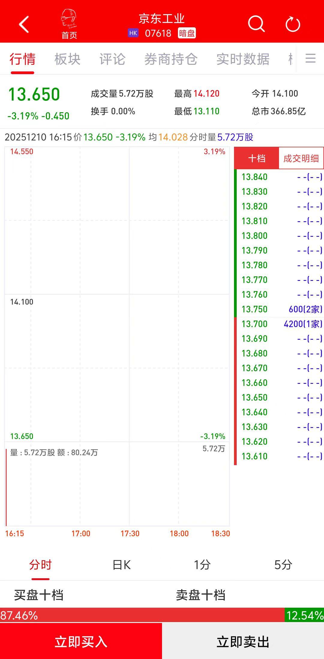 | | | 京东工业 | | 0 | | --- | --- | --- | --- | --- | | 首页 | HK 07618 暗盘 | | | | | 行情 板块 | 评论 | 券商持仓 实时数据 | | = 大 | | 13.650 | 成交量5.72万股 | 最高 14.120 | 今开 14.100 | | | -3.19% -0.450 | 换手 0.00% | 最低 13.110 | 总市366.85亿 | | | 20251210 16:15 价 13.650 -3.19% 均 14.028 分时量5.72万股 | | | | | | 14.550 | | 3.19% | | | | | | | 十档 | 成交明细 | | | | | 13.840 | - = - | | | | | 13.830 | - - (- - ) | | | | | 13.820 | - - (- -) | | | | | 13.810 | - - ( - - ) | | | | | 13.800 | - - ( - - ) | | | | | 13.790 | - - ( - - ) | | | | | 13. ...