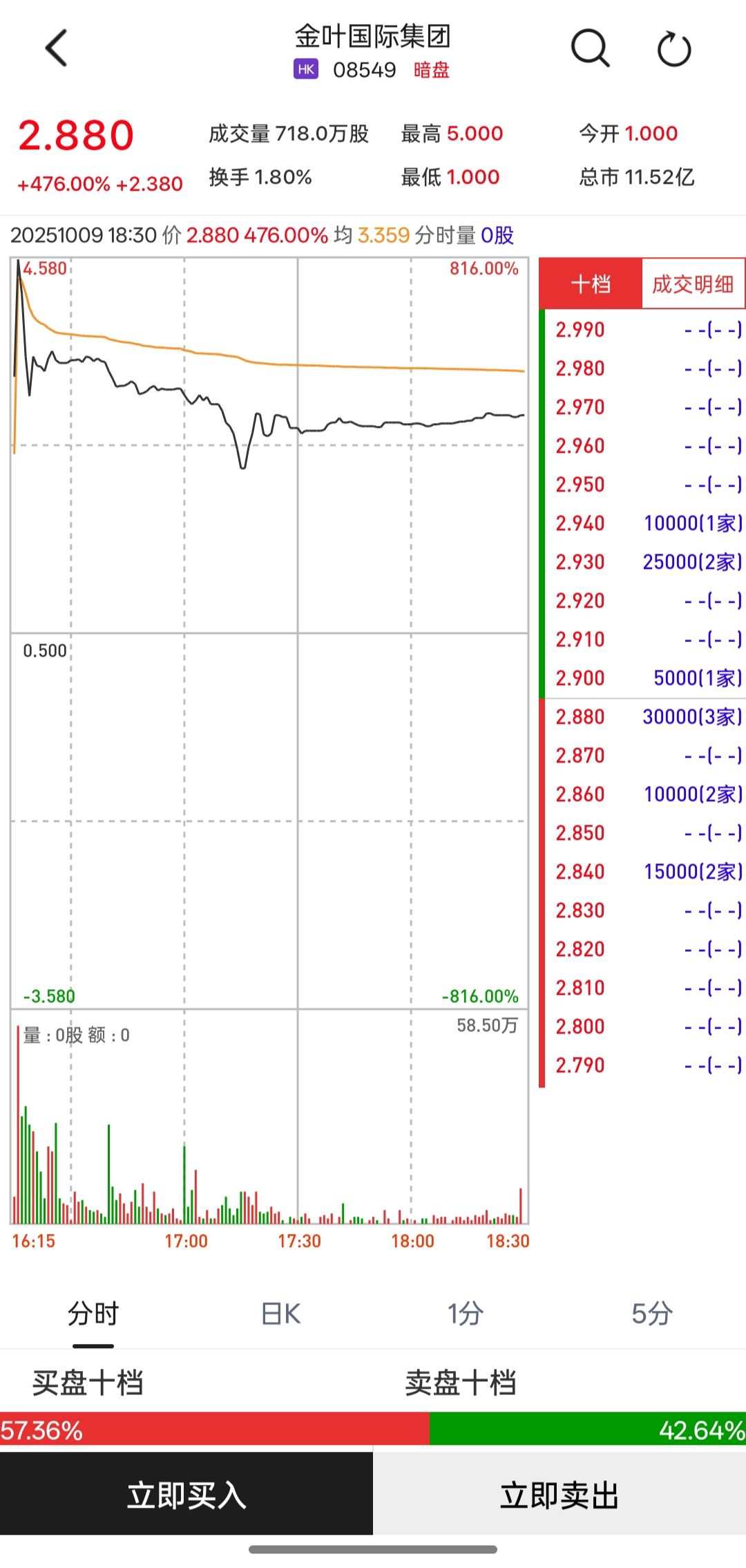 Group 1 - The core point of the article is that Golden Leaf International Group (08549) will be listed on the Hong Kong Stock Exchange on October 10, with a significant increase in its trading price compared to the initial offering price [1] - The stock is currently trading at HKD 2.88, which represents a 476.0% increase from the offering price of HKD 0.5 [1] - Each lot consists of 5,000 shares, and investors could potentially earn HKD 11,900 per lot, excluding transaction fees [1] Group 2 - The trading data shows a buy-sell ratio of 57.36% to 42.64%, indicating a stronger buying interest in the stock [3]