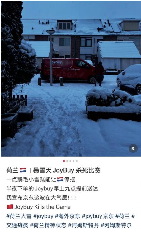近日,一股强极地寒潮席卷欧洲多地,多国出现持续降雪、冻雨等极端天气,交通出行和物流运输受到 不同程度影响。 然而,在社交平台上,不少在欧洲生活的网友发帖表示,自己在大雪天的欧洲大陆看到了熟悉的"京东 红",并感叹物流速度之快,"半夜下单,早上九点提前送达",还有网友表示"打算发到 ins上震撼一下 外国人"。据了解,这些网友通过京东旗下欧洲零售电商 Joybuy 下单,京东快递小哥身着红色工服送货 上门。 多位在荷兰的华人网友表示,寒潮来临当天,荷兰全国交通停摆的情况下,自己通过 Joybuy 下单的商 品甚至在第二天一早提前送达。 图:德国网友分享Joybuy次日达购物体验 图:法国网友分享Joybuy次日达购物体验 | 真的做到了 NB | | --- | | 昨天 14:50 英国 回复 | | 整个欧洲的电商都颤抖吧 | | 昨天 14:51 英国 回复 | | 哈哈这个天还点了外卖虽然慢了好多 | | 昨天 19:42 荷兰 回复 | | 我们昨天也是 周一晚上十点下单 第二天早上七点半 | | 送到 | | 昨天 09:34 荷兰 回复 | | 我借一下你的第二张包裹图,我的拆完就扔 | | 了, ...