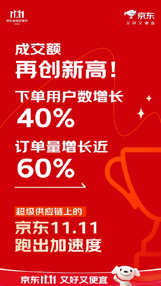 京东披露“双11”成绩单:下单用户数增长40%,订单量增长近60%