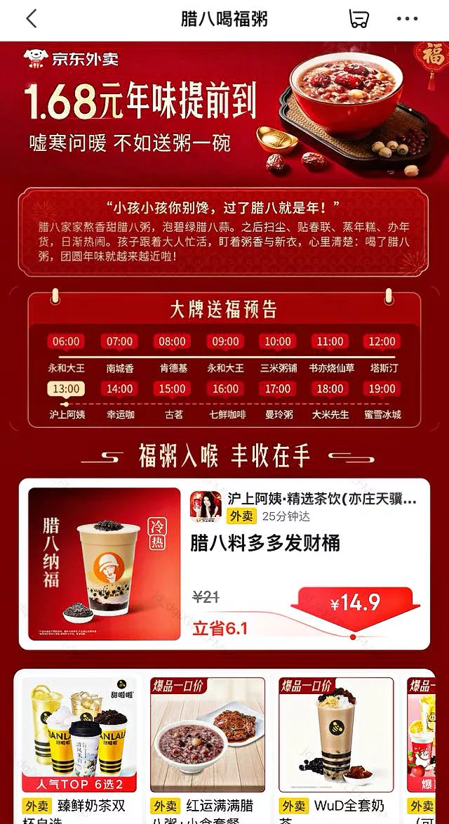 1月26日是腊八节,国人自古就有腊八喝粥祈福纳祥、阖家团圆的传统习俗。一碗好粥象征热乎有福, 也可表达对亲朋好友的关心祝福。腊八当天,京东外卖将联合三米粥铺、曼玲粥、永和大王、沪上阿 姨、古茗等餐饮品牌,推出百款品质好粥,一件免运费。传统腊八粥低至1.68元,新式奶茶粥小料多 多。活动覆盖早餐、午餐、下午茶、晚餐全天场景。同时,京东外卖已在全国多城上线加热餐箱配送服 务,让每一口粥都热乎暖心。消费者可通过京东APP"秒送"频道下单。 一碗好粥,不仅关乎口味,更关乎温度。京东外卖加热餐箱配送服务持续扩大覆盖范围,把冬日喝粥的 热乎感稳稳拿捏。腊八当天,北京、上海、乌鲁木齐、哈尔滨、南昌的用户通过京东外卖下单,平台将 优先匹配加热餐箱骑手配送,通过科技加持,能比普通餐箱高出20℃的箱内温度,本月底前将覆盖全国 11座城市,并为全职骑手免费配置。 腊八喝好粥,上京东外卖!打工人提前预定,一早就能喝上方便省心,上京东外卖。老板请客,办公室 新式奶茶粥暖心团建,上京东外卖。一份全家福套餐,轻松拉满全家人晚餐节日仪式感,上京东外卖。 给远在异地的父母一键下单尽孝心,上京东外卖。 腊八当天,9:00-12:00、17:00 ...