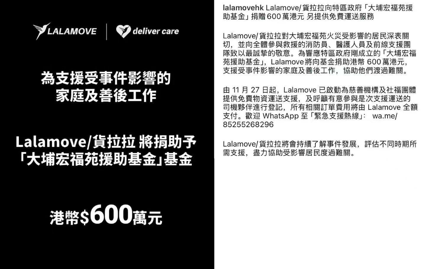 11月26日,香港大埔宏福苑发生严重火灾。顺丰、货拉拉、极兔速递、中通快递、京东物流等多家物流企业宣布捐赠资金及物资,并提供运力支持。 南都湾财社记者获悉,货拉拉(Lalamove)于11月28日宣布,向香港特区政府成立的"大埔宏福苑援助基金"捐助600万港元,支援受灾家庭及善后工作。货 拉拉方面表示,11月27日起,已启动为慈善机构及社会福利团体提供免费物资运输支援,订单相关费用由货拉拉全额支付。 顺丰也宣布启动应急响应机制,第一时间捐赠2000万港元,用于受灾居民的医疗救助、生活物资保障以及灾后重建。南都湾财社记者从顺丰方面获悉,11月 27日起,开放全港146个顺丰站,提供免费救援物资运输服务。同时,顺丰在香港成立了义工队,全力协助救援工作。 极兔速递启动了1000万港元捐款,用于支持受灾居民的紧急安置、基本生活保障、情绪疏导及灾后恢复等相关工作,以协助灾区尽快渡过难关。同时,公司 已开通对港绿色通道,优先运送救灾相关物资,保障物资能够第一时间抵港。极兔速递表示,向在此次火灾中遇难的市民致以深切哀悼,向受影响的家庭与 社区表达诚挚慰问,并向所有奋战在救援一线的消防员及工作人员致以崇高敬意。 中通快递向" ...