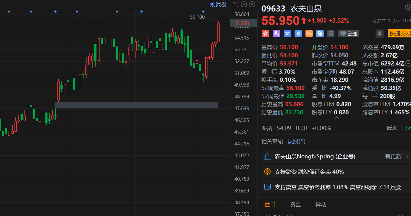 Core Viewpoint - Nongfu Spring (9633.HK) continues its upward trend, rising 3.5% to HKD 56.1, reaching a recent high and accumulating over 10% increase in the past five days, with a market capitalization of HKD 628.2 billion [1] Group 1: Stock Performance - The stock price of Nongfu Spring reached a high of HKD 56.1, with a trading volume of 4.7969 million shares and a total transaction value of HKD 267 million [2] - The stock has shown a price fluctuation of 3.7% and a price-to-earnings ratio of 48.07, indicating a strong market interest [2] - The market capitalization is reported at HKD 629.24 billion, with a circulating value of HKD 281.69 billion [2] Group 2: New Product Launch - Nongfu Spring's coffee brand, Tanxi, has launched two new products: a sugar-free Americano and a low-sugar latte, priced at HKD 5 for 400ml [2][3] - This product launch is a significant move into the ready-to-drink coffee market, aimed at enhancing the product matrix and reaching a broader consumer base [3] - The pricing strategy for these new products significantly lowers the consumption threshold for high-quality ready-to-drink coffee, potentially reshaping the competitive landscape in this market segment [3]