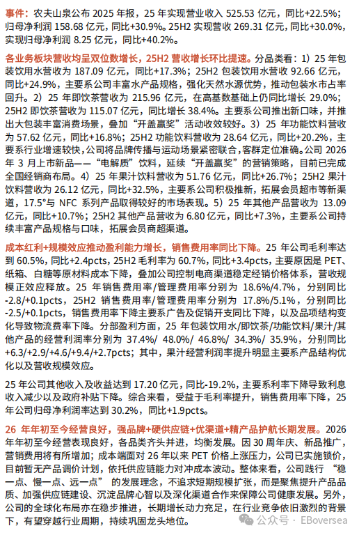 报告发布信息 报告标题:《25H2 营收增长环比提速,长期发展动力充足——农夫山泉(9633.HK)2025 年报点评》 报告发布日期:2026年3月27日 分析师:陈彦彤(执业证书编号:S0930518070002) 分析师:汪航宇(执业证书编号:S0930523070002) 【特别声明】本订阅号中所涉及的证券研究信息由光大证券海外TMT研究团队编写,仅面向光大证券 专业投资者客户,用作新媒体形势下研究信息和研究观点的沟通交流。非光大证券专业投资者客户,请 勿订阅、接收或使用本订阅号中的任何信息。本订阅号难以设置访问权限,若给您造成不便,敬请谅 解。光大证券研究所不会因关注、收到或阅读本订阅号推送内容而视相关人员为光大证券的客户。 要点 事件:农夫山泉公布 2025年报,25年实现营业收入 525.53 亿元,同比+22.5%; 归母净利润 158.68亿元,同比+30.9%。25H2 实现营收 269.31 亿元,同比+30.0%, 实现归母净利润 8.25亿元,同比+40.2%。 各业务板块营收均呈双位数增长,25H2 营收增长环比提速。分品类看:1)25 年包 装饮用水营收为 187.09 亿元,同 ...