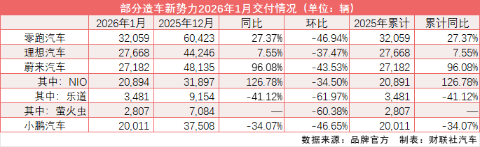 智通财经2月1日讯(记者 徐昊)2月1日,造车新势力零跑、理想、蔚来和小鹏先后发布1月交付量。四 家车企均实现同比增长,但相较于去年12月,交付表现出现明显下滑。 "因为年初是传统的市场淡季,再叠加去年底免征车辆购置税政策的截止,提前透支了一部分需求,导 致今年市场大盘下滑幅度整体比较大。"一位新势力车企负责人对智通财经记者表示。 | | | | 部分造车新势力2026年1月交付情况(单位:辆) | | | | | --- | --- | --- | --- | --- | --- | --- | | | 2026年1月 | 2025年12月 | 同比 | 环比 | 2025年累计 | 累计同比 | | 零跑汽车 | 32.059 | 60.423 | 27.37% | -46.94% | 32.059 | 27.37% | | 理想汽车 | 27.668 | 44.246 | 7.55% | -37.47% | 27.668 | 7.55% | | 蔚来汽车 | 27.182 | 48.135 | 96.08% | -43.53% | 27,182 | 96.08% | | 其中:NIO | 20.894 ...