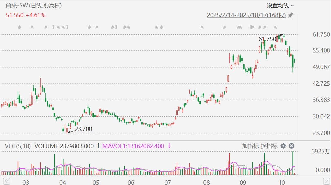 昨晚,蔚来方面回应称,本案件不是新发生的事件,并非针对蔚来近期经营状况,源于2022年6月做空 机构灰熊在一份做空报告中对蔚来的不实指控。为保护全体股东权益,2022年8月,公司董事会独立委 员会在第三方国际律所和法证会计师事务所的协助下,针对做空报告完成了独立内部调查,相关指控均 无事实依据。 昨日一度大跌13%的蔚来-SW(9866.HK)今日盘中反弹,盘初一度涨超6%报52.3港元。 消息面上,蔚来遭新加坡主权财富基金GIC起诉,指控蔚来及其高层虚报收入,蔚来昨日股价一度大跌 13%。该诉讼于8月在纽约南区提起,被告包括蔚来、CEO李斌及前CFO奉玮。根据10月3日的法庭文 件,一名法官下令暂时中止GIC对蔚来的案件,原因据报是因为与一桩先前的集体诉讼高度相似,以避 免资源浪费和潜在冲突。 相关事件 蔚来-SW(09866.HK):9月交付34,749辆汽车,同比增长64.1% 蔚来-SW(09866.HK):2025蔚来日在杭州 举办 ...