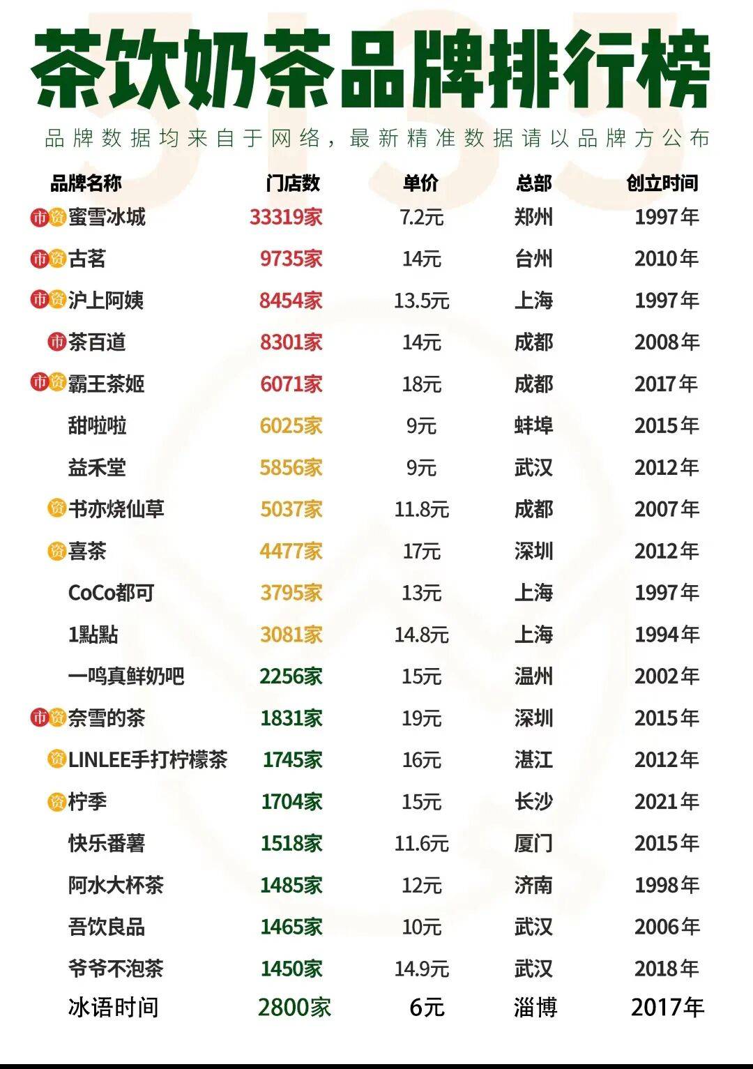 | 品牌名称 | 门店数 | 東北 | 总部 | 创立时间 | | --- | --- | --- | --- | --- | | 市资管 水城 | 33319家 | 7.2元 | 关系外 | 1997年 | | 市海古名 | 9735家 | 14元 | 台州 | 2010年 | | 00 沪上阿姨 | 8454 x | 13.5元 | 上海 | 1997年 | | 世奈自道 | 8301家 | 14元 | 成都 | 2008年 | | 10 霸王茶姬 | 6071家 | 18元 | DZER | 2017年 | | 舌目喷垃 | 6025 家 | 9元 | 蚌埠 | 2015年 | | 益未堂 | 58563 | 9元 | 武汉 | 2012年 | | 窗书亦烧仙草 | 5037家 | 11.8元 | 成都 | 2007年 | | 货营资 | 4477 家 | 17元 | 深圳 | 2012年 | | CoCo都可 | 3795家 | 13元 | 上海 | 1997年 | | T 點點 | 3081家 | 14.8元 | 上海 | 1994年 | | 一鸣真鲜奶吧 | 2256家 | 15元 | 温州 | ...