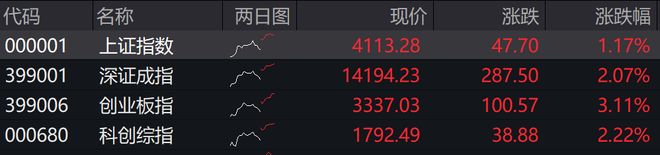 作者 |一财阿驴 11:31 A股午盘丨创业板指半日涨超3% 截至午盘,沪指涨1.17%,深成指涨2.07%,创业板指涨3.11%,科创综指涨2.22%。 | 代码 | 名称 | 两日图 | 现价 | 涨跌 | 涨跌幅 | | --- | --- | --- | --- | --- | --- | | 000001 | 上证指数 | 1 | 4113.28 | 47.70 | 1.17% | | 399001 | 深证成指 | 7 | 14194.23 | 287.50 | 2.07% | | 399006 | 创业板指 | 3 | 3337.03 | 100.57 | 3.11% | | 000680 | 科创综指 | 5 | 1792.49 | 38.88 | 2.22% | 盘面上,算力硬件产业链爆发,CPO、存储器方向领涨;光伏产业链走强,太空光伏方向活跃;AI应 用、半导体、商业航天、消费电子题材涨幅靠前。 2026.02.06 沪指高开0.93%,深成指高开1.50%,创业板指高开1.95%,科创综指高开1.99%。 | 代码 | 名称 | 两日图 | 现价 | 涨跌 | 涨跌幅 | | --- ...