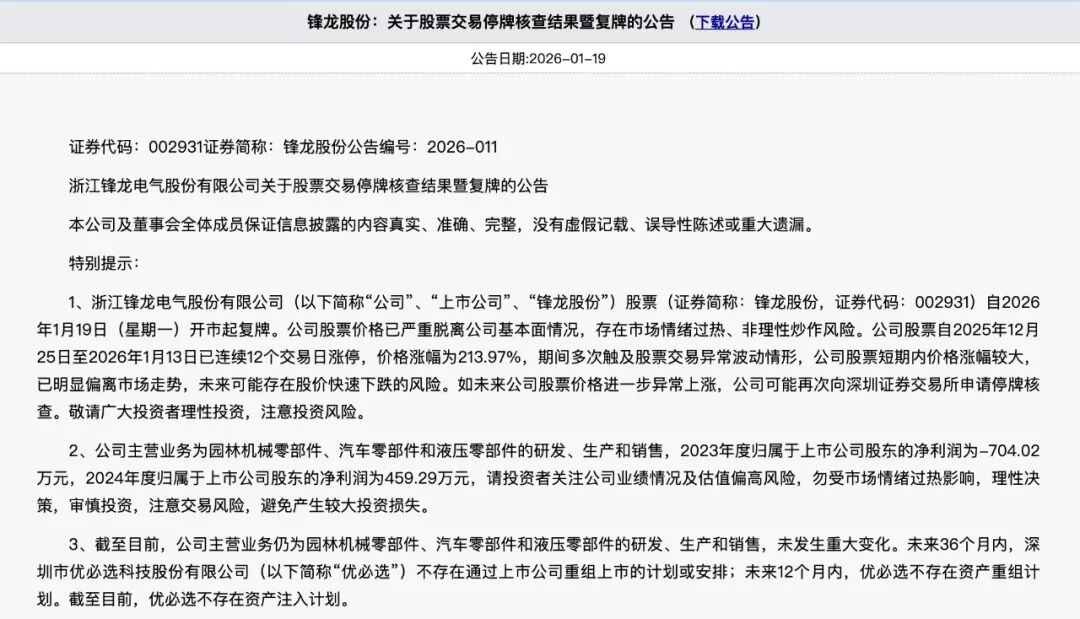 公告中还称,公司股票价格已严重脱离公司基本面情况,存在市场情绪过热、非理性炒作风险。公司股票自2025年12月25日至2026年1月13日已连续12个 交易日涨停,价格涨幅为213.97%,期间多次触及股票交易异常波动情形,公司股票短期内价格涨幅较大,已明显偏离市场走势,未来可能存在股价快速 下跌的风险。如未来公司股票价格进一步异常上涨,公司可能再次向深圳证券交易所申请停牌核查。 1月18日,锋龙股份(002931)(002931.SZ)公告称,公司股票自2026年1月19日开市起复牌。 停牌期间,公司就股票交易波动情况进行了核查。目前,相关核查工作已完成。 截至目前,公司主营业务仍为园林机械零部件、汽车零部件和液压零部件的研发、生产和销售,未发生重大变化。未来36个月内,深圳市优必选科技股份 有限公司(以下简称"优必选")不存在通过上市公司重组上市的计划或安排;未来12个月内,优必选不存在资产重组计划。截至目前,优必选不存在资产注 入计划。 交易行情显示,2025年12月17日—2026年1月13日,锋龙股份接连斩获13个涨停板,区间累计涨幅245.39%。截至1月13日收盘,公司股价收于涨停价61.79 ...