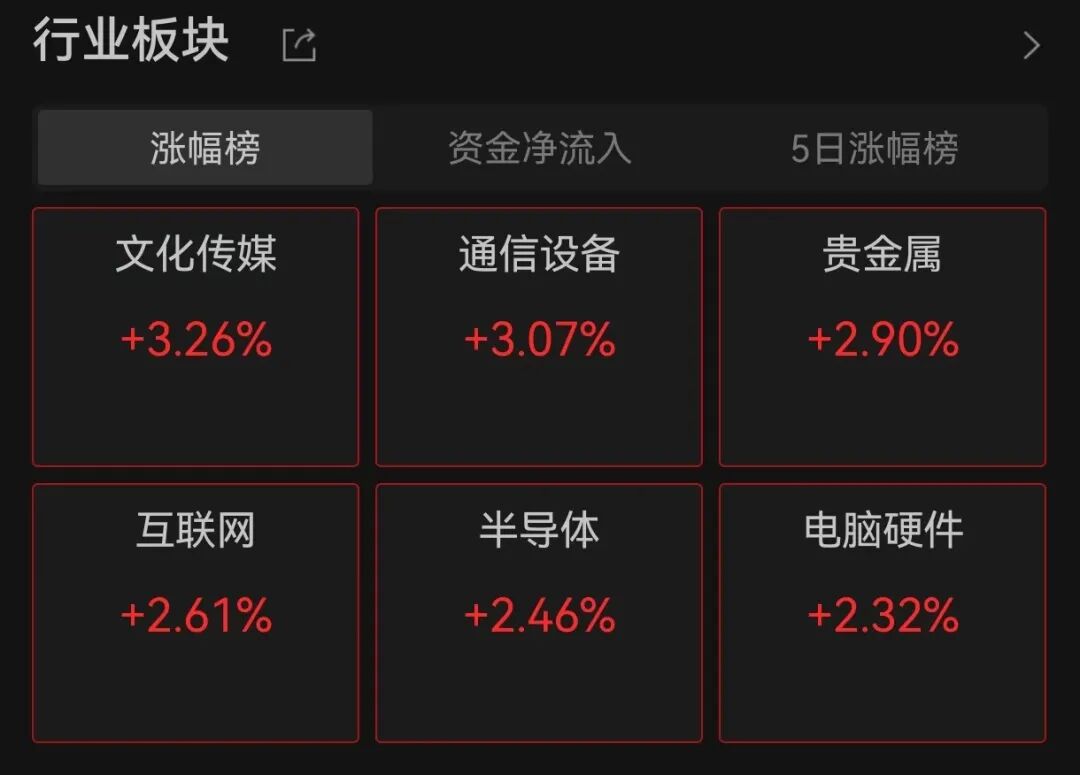 作者 |一财阿驴 11:31 A股午盘丨创业板指半日涨超3% 截至午盘,沪指涨1.17%,深成指涨2.07%,创业板指涨3.11%,科创综指涨2.22%。 | 代码 | 名称 | 两日图 | 现价 | 涨跌 | 涨跌幅 | | --- | --- | --- | --- | --- | --- | | 000001 | 上证指数 | 1 | 4113.28 | 47.70 | 1.17% | | 399001 | 深证成指 | 7 | 14194.23 | 287.50 | 2.07% | | 399006 | 创业板指 | 3 | 3337.03 | 100.57 | 3.11% | | 000680 | 科创综指 | 5 | 1792.49 | 38.88 | 2.22% | 盘面上,算力硬件产业链爆发,CPO、存储器方向领涨;光伏产业链走强,太空光伏方向活跃;AI应 用、半导体、商业航天、消费电子题材涨幅靠前。 2026.02.06 沪指高开0.93%,深成指高开1.50%,创业板指高开1.95%,科创综指高开1.99%。 | 代码 | 名称 | 两日图 | 现价 | 涨跌 | 涨跌幅 | | --- ...