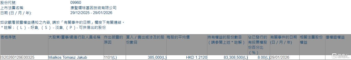 康圣环球(09960.HK)获Mialkos Tomasz Jakub增持38.5万股