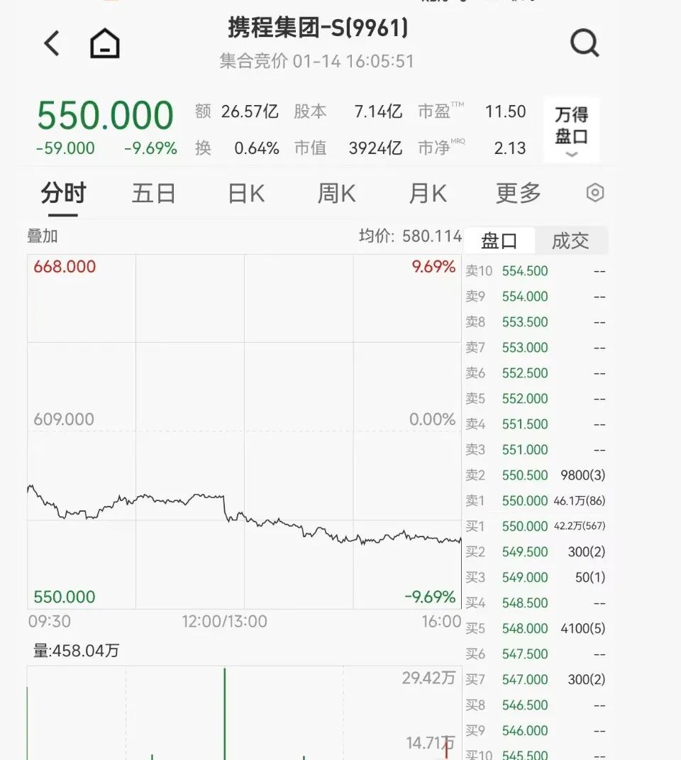 | < 日 | | 携程集团-S(9961) | | | | | | --- | --- | --- | --- | --- | --- | --- | | | | 集合竞价 01-14 16:05:51 | | | | | | 550.000 | | 额 26.57亿 股本 7.14亿 市盈" | | | 11.50 | 万得 | | -59.000 | -9.69% | 0.64% 市值 3924亿 市净 换 | | | 2.13 | 营口 | | 关时 | 五日 | 日K 周K | 月K | | 重义 | | | 叠加 | | | 均价: 580.114 | | 盘口 | 成交 | | 668.000 | | | 9.69% | | 卖10 554.500 | | | | | | | 至9 | 554.000 | | | | | | | 卖8 | 553.500 | | | | | | | 英7 | 553.000 | | | | | | | 重点 | 552.500 | -- | | | | | | 菜5 | 552.000 | | | 609.000 | | | 0.00% | 壶4 | 551.5 ...
