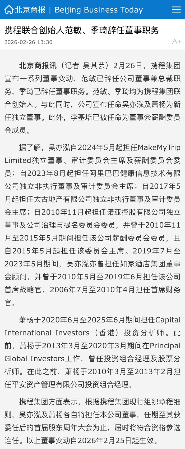 #携程宣布一系列董事变动# 【携程联合创始人范敏、季琦辞任董事职务】2月26日,携程集团宣布一系 列董事变动,范敏已辞任公司董事兼总裁职务,季琦已辞任董事职务。范敏、季琦均为携程集团联合创 始人。与此同时,公司宣布任命吴亦泓及萧杨为新任独立董事。此外,李基培已被任命为董事会薪酬委 员会成员。(北京商报记者 吴其芸) 2023年5月期间,吴亦泓亦曾担任如家酒店集团董事 会顾问,并曾于2010年5月至2019年6月担任该公司 首席战略官,2006年7月至2010年4月担任首席财务 官。 萧杨于2020年6月至2025年6月期间担任Capital International Investors(香港)投资分析师。此 前,萧杨于2013年3月至2020年3月期间在Principal Global Investors工作,曾任投资组合经理及股票分 析师。在此之前,萧杨于2010年3月至2013年2月担 任平安资产管理有限公司投资组合经理。 携程集团方面表示,根据携程集团现行组织章程细 则,吴亦泓及萧杨各自将担任本公司董事,任期至其获 委任后的首届股东周年大会为止,届时将符合资格参选 连任。以上董事变动自2026年2月2 ...